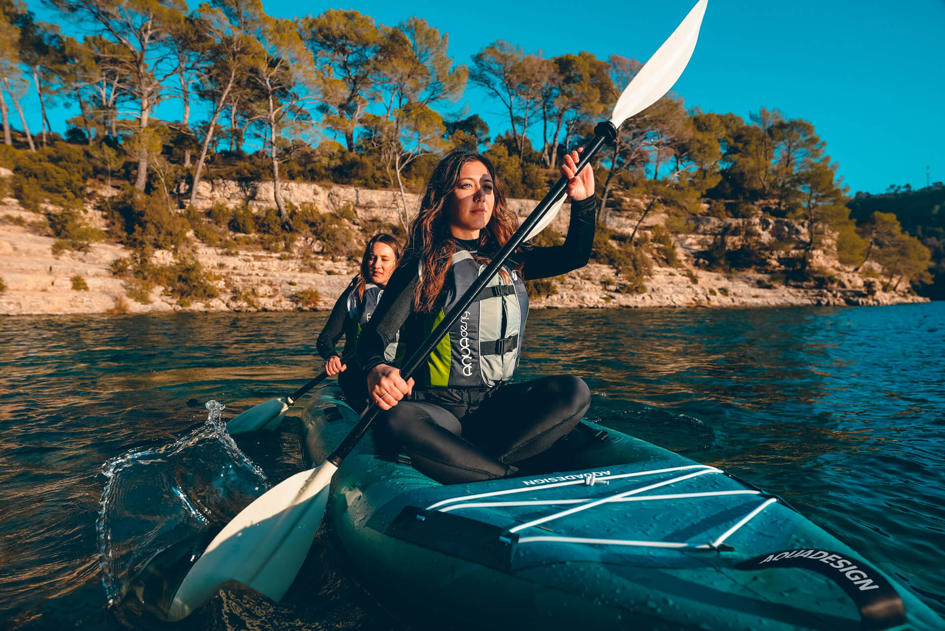 Dostarczany w opakowaniu zawierającym 2 wiosła kajakowe 4-częściowe, 2 siedziska kajakowe z możliwością regulacji co do centymetra dla większego komfortu, pompę wysokociśnieniową AquaDesign, torbę do łatwego transportu i przechowywania oraz dwa zdejmowane skegi.
